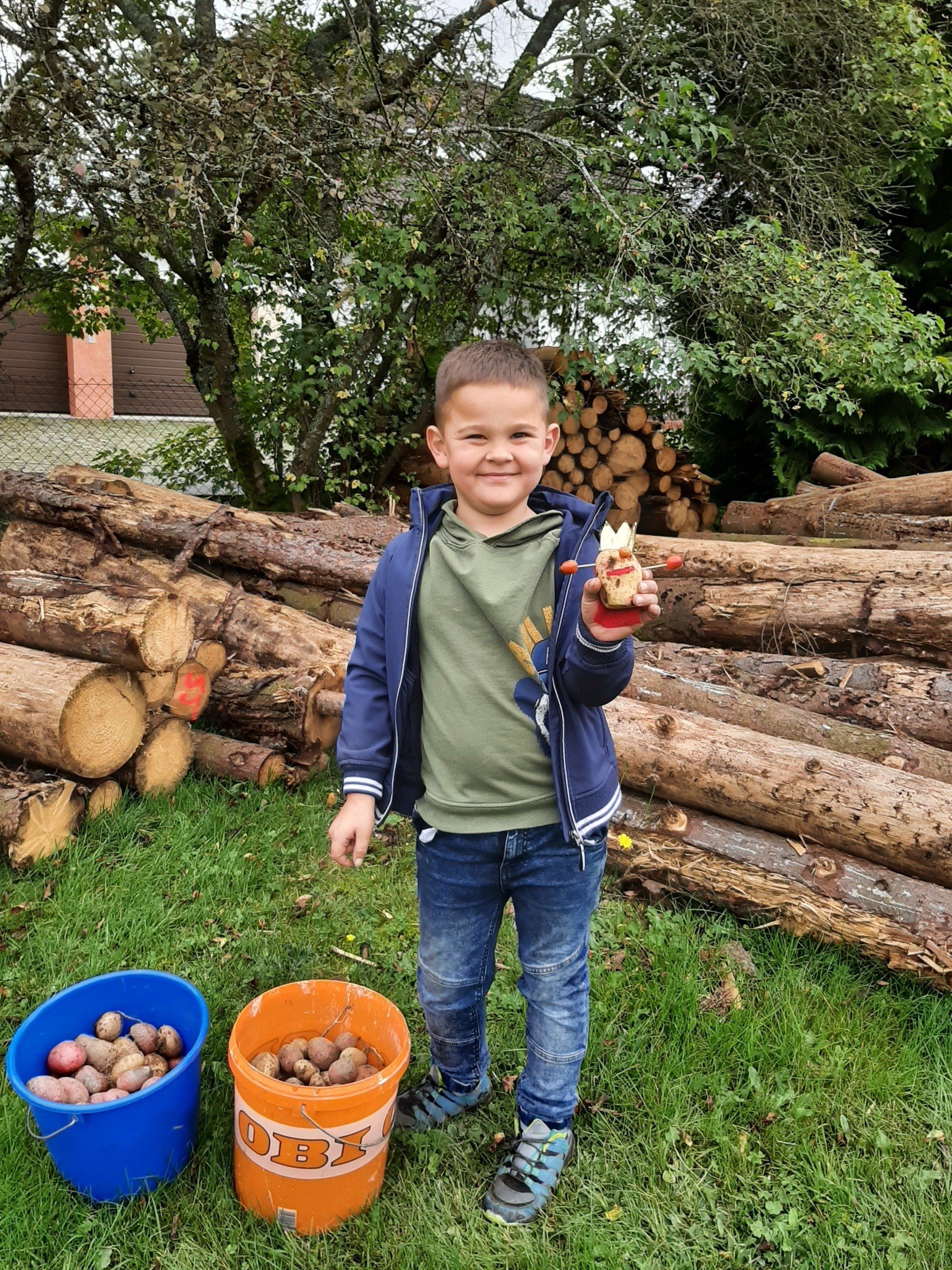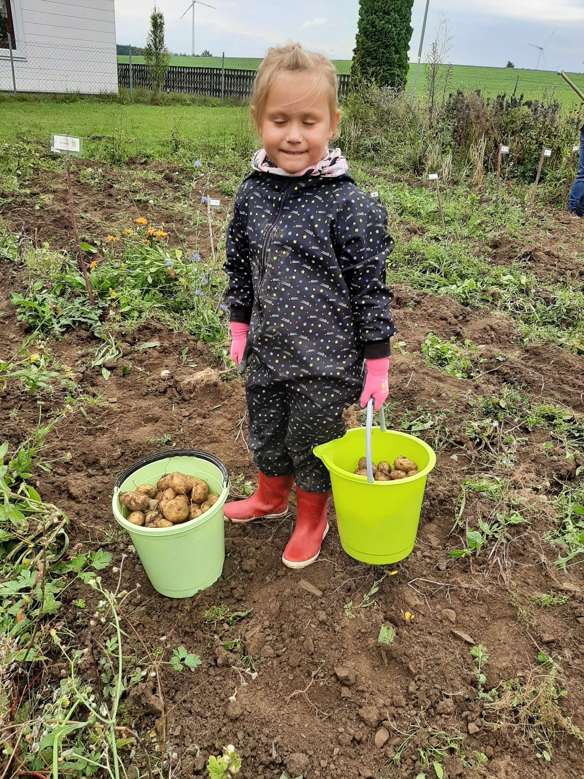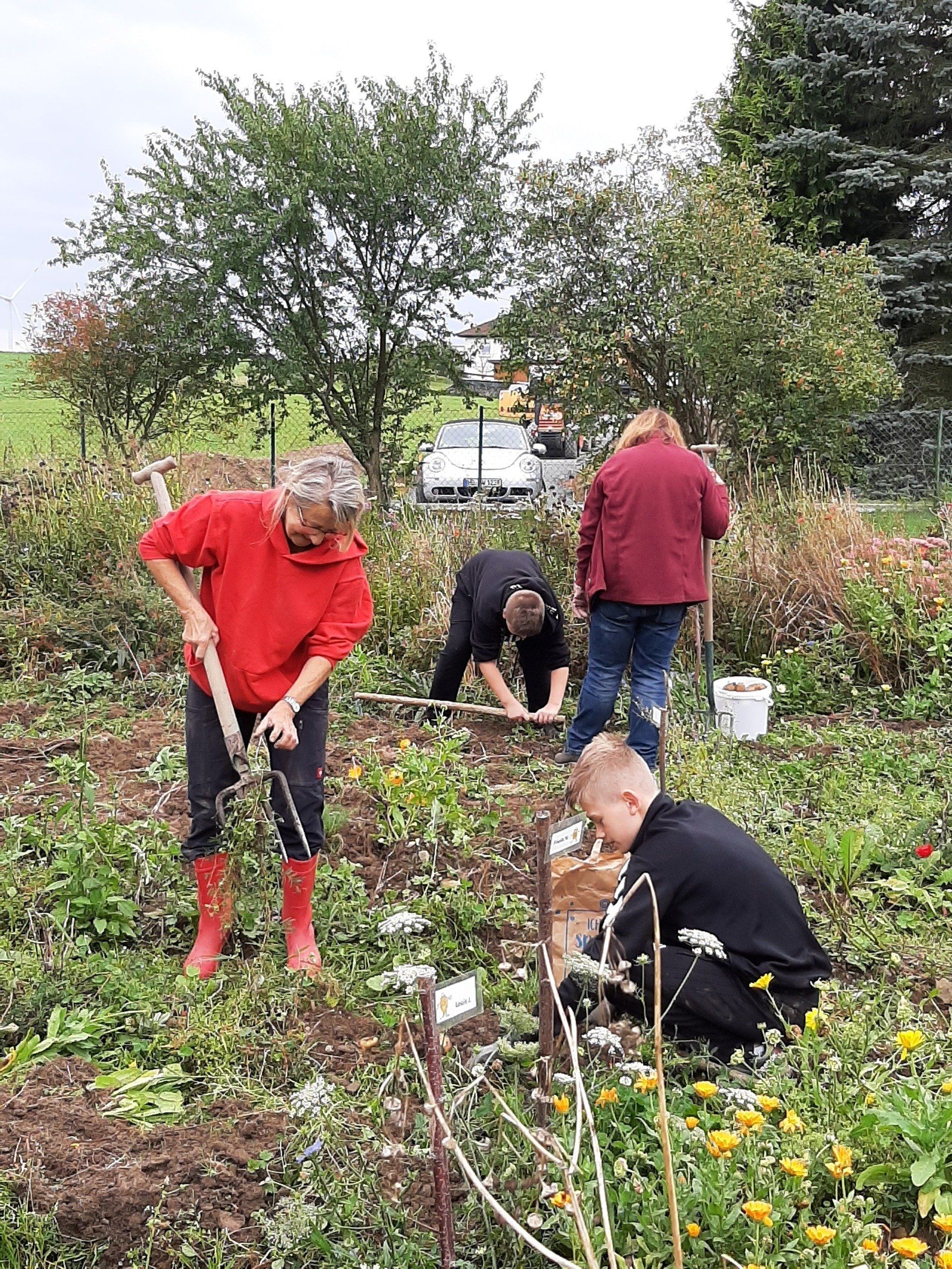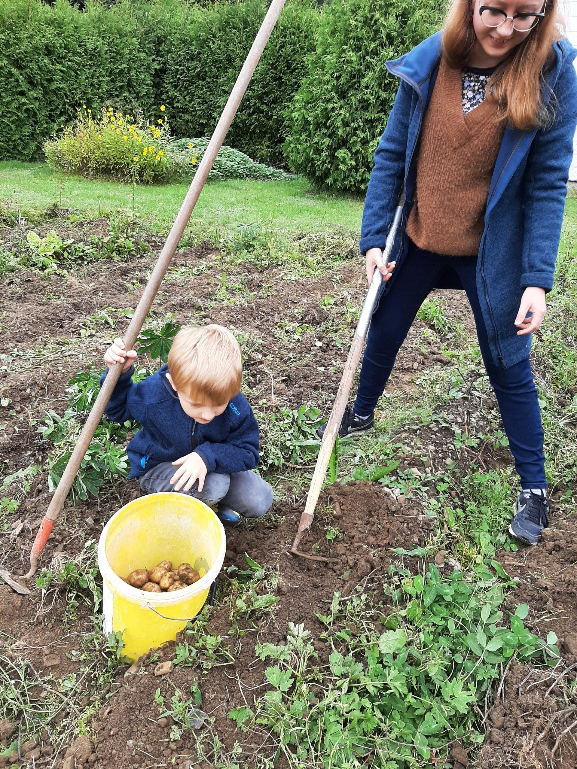 Mitte September wurden Kartoffeln geerntet. Insgesamt kamen 37 Kinder um ihre im Frühjahr gesteckten Kartoffeln zu ernten. Aus terminlichen Gründen kamen einige Kinder an anderen Tagen. Am "Haupterntetag" wurde die Feuerschale wieder in Betrieb genommen und Stockbrot gegrillt. Daneben gab es Kartoffeln mit Quark, Kartoffelsuppe und Kuchen.