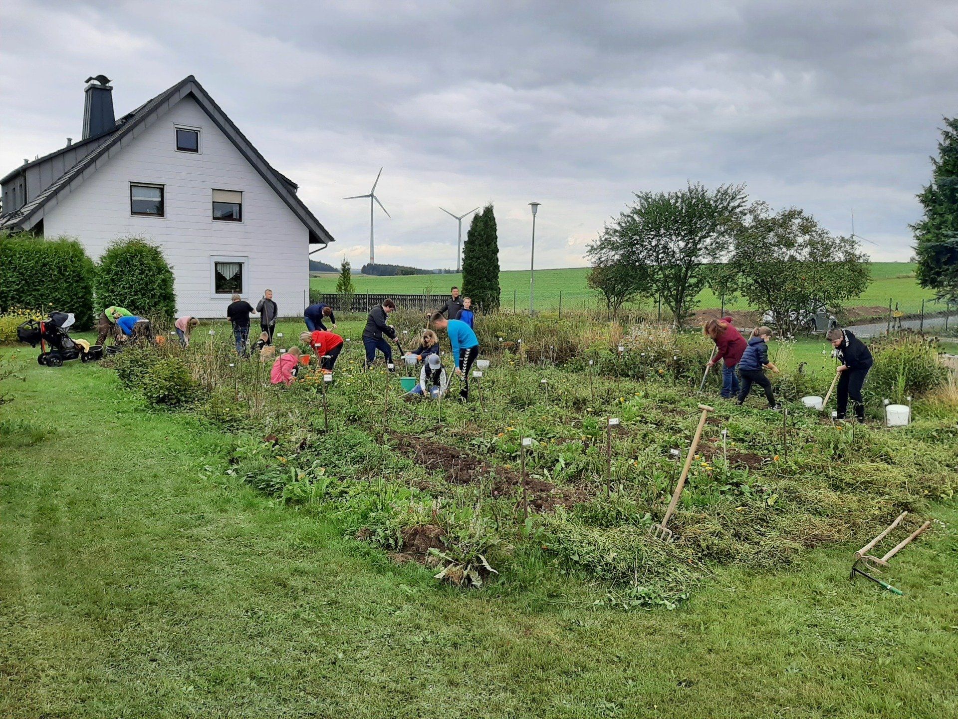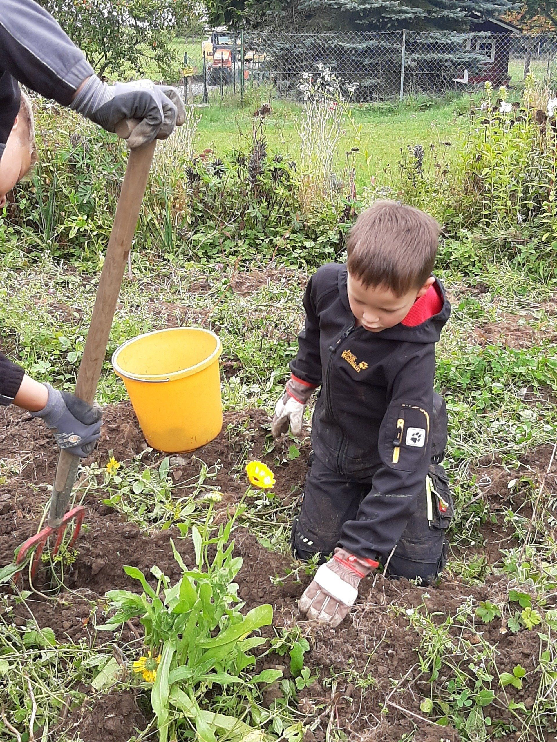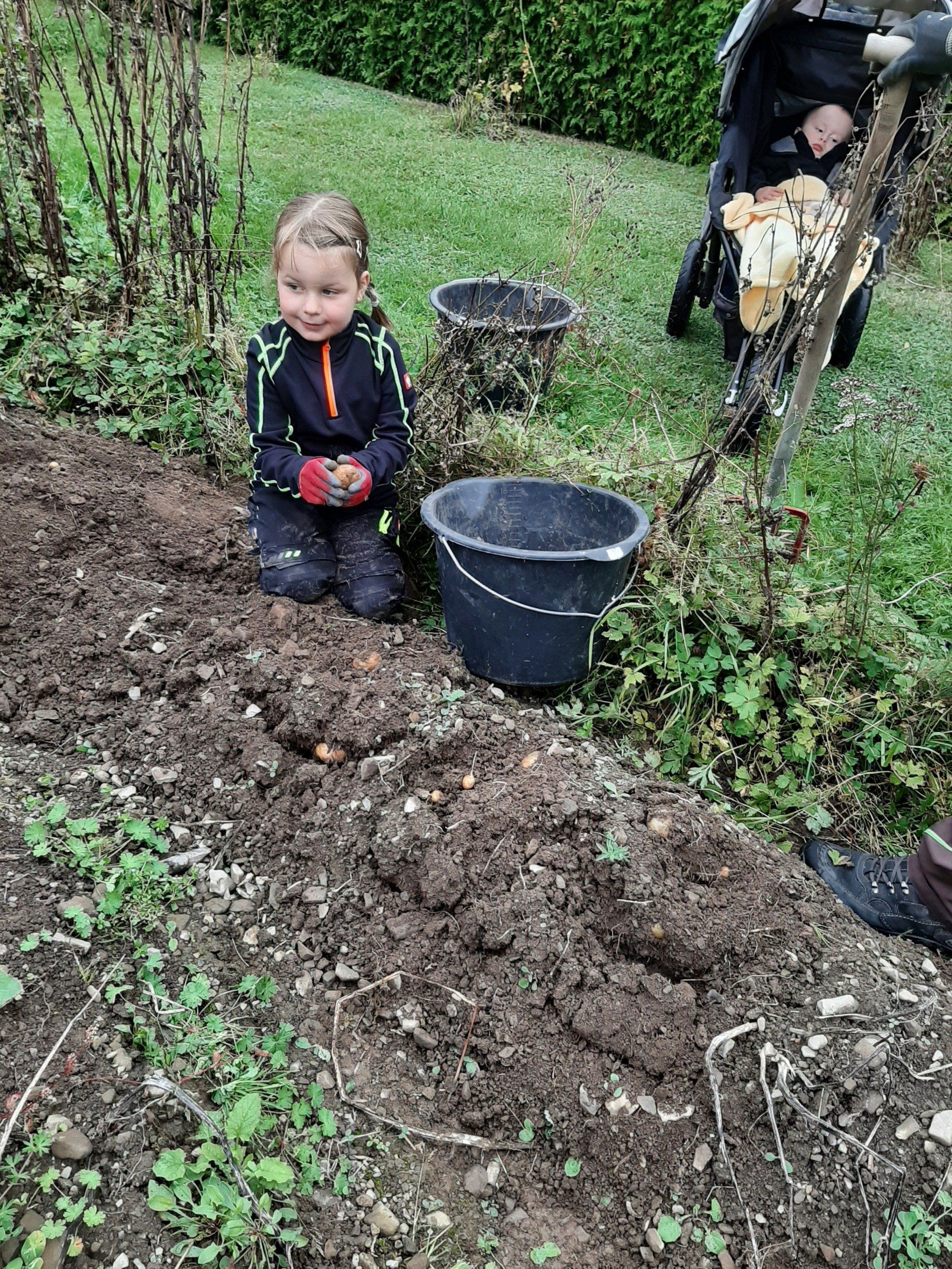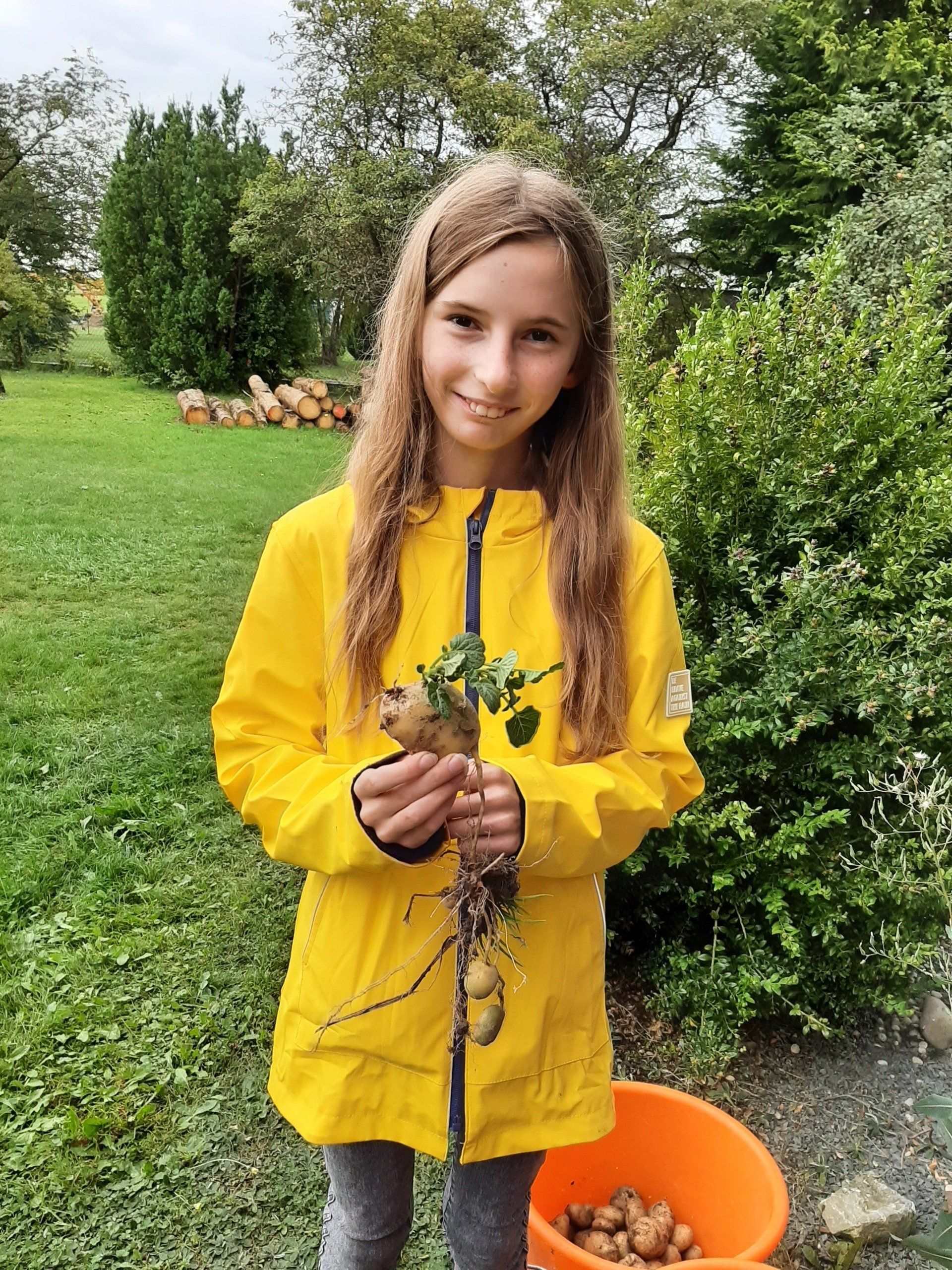 Mitte September wurden Kartoffeln geerntet. Insgesamt kamen 37 Kinder um ihre im Frühjahr gesteckten Kartoffeln zu ernten. Aus terminlichen Gründen kamen einige Kinder an anderen Tagen. Am "Haupterntetag" wurde die Feuerschale wieder in Betrieb genommen und Stockbrot gegrillt. Daneben gab es Kartoffeln mit Quark, Kartoffelsuppe und Kuchen.