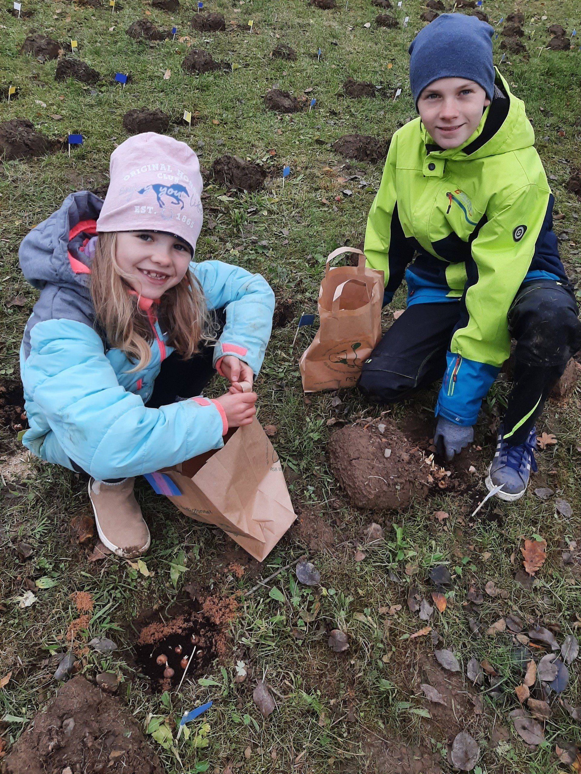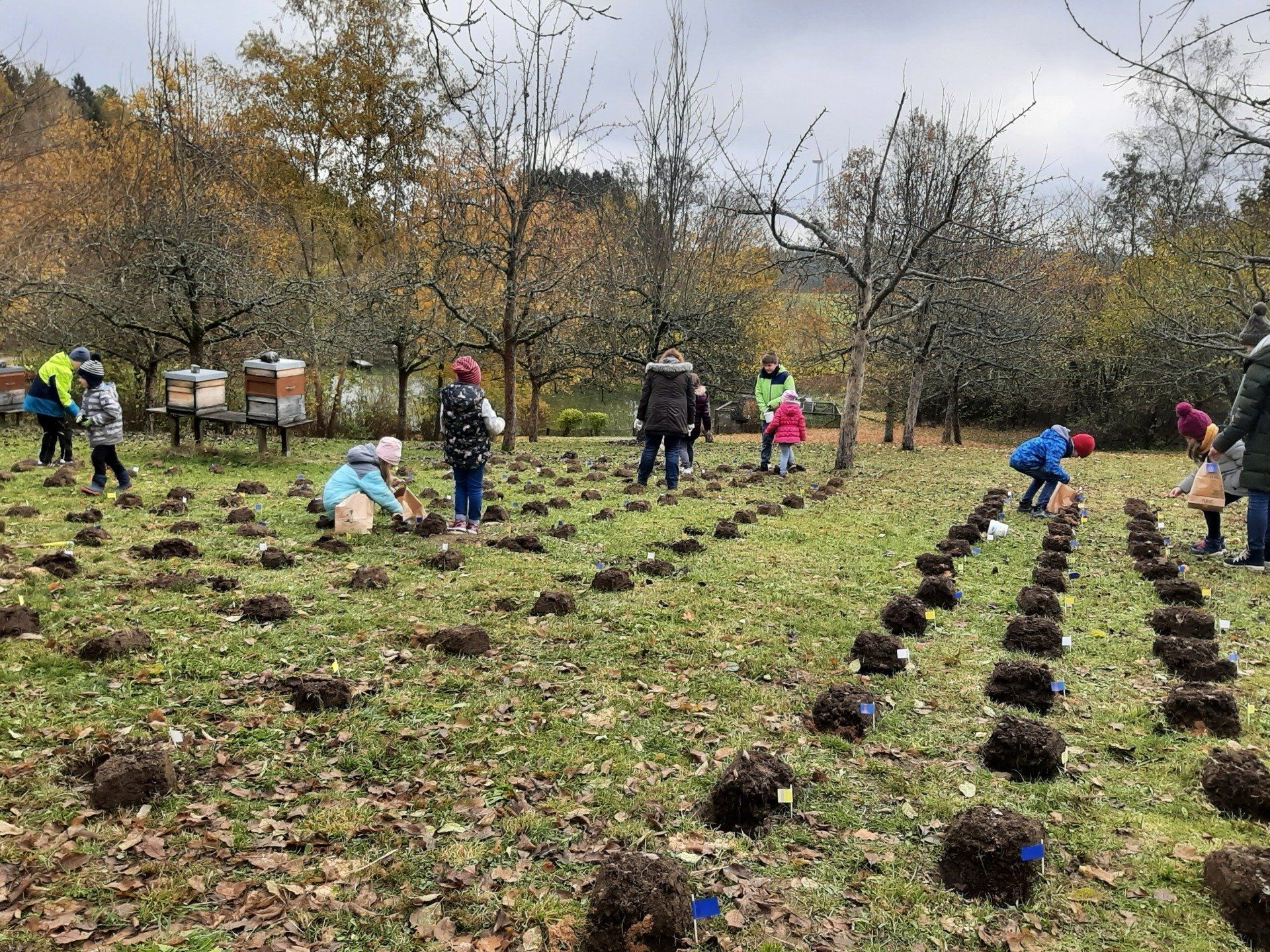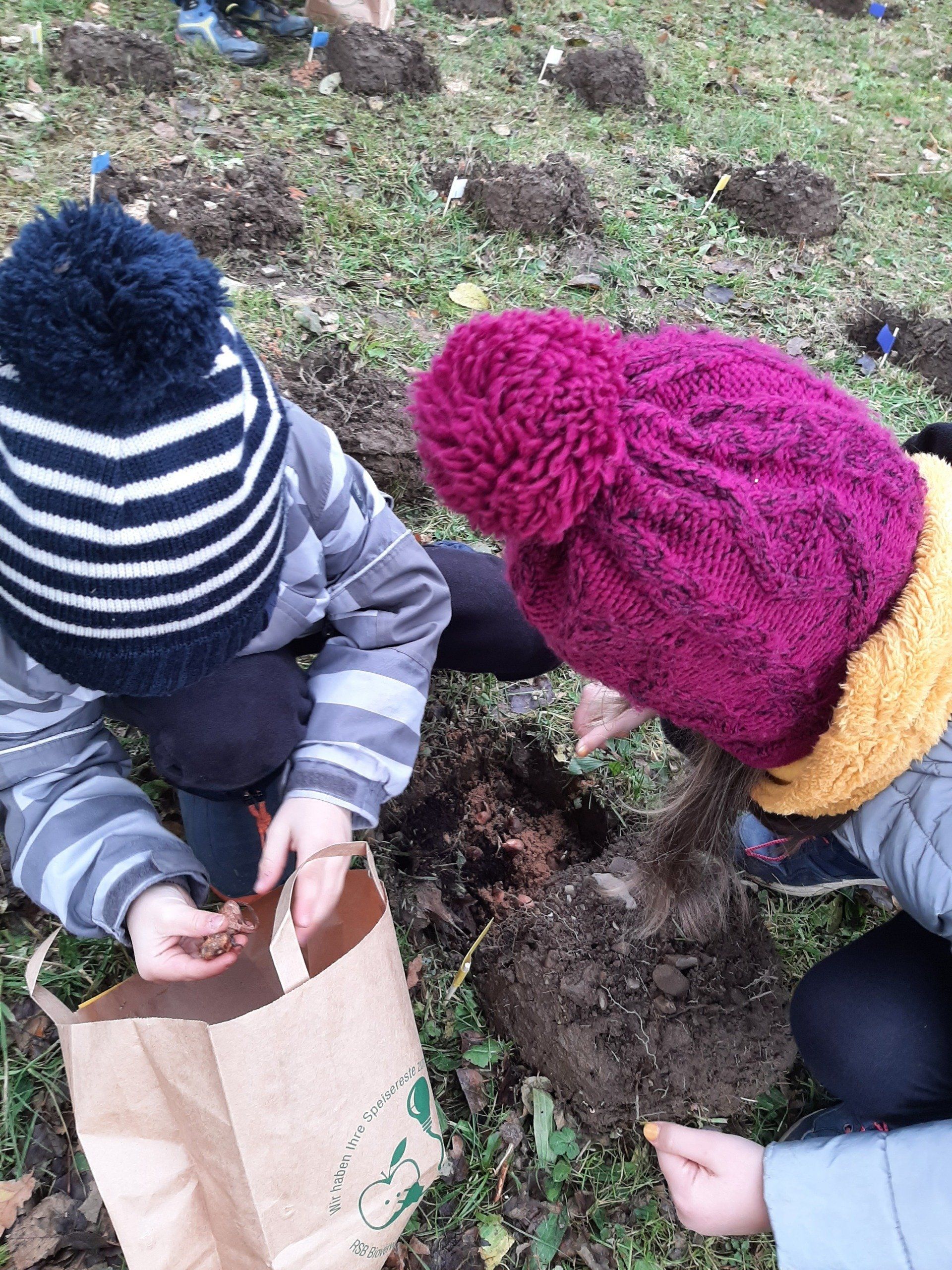 Fleißige Helfer hatten im Vorfeld schon über 300 Löcher ausgestochen. Die Aufgabe der Kinder war es nun, die Löcher mit Sand und Dünger und Krokussen zu füllen. Rund 2500 Krokuszwiebeln wurden so auf der großen Wiese gesteckt. Nach getaner Arbeit gab es noch eine Brotzeit.
