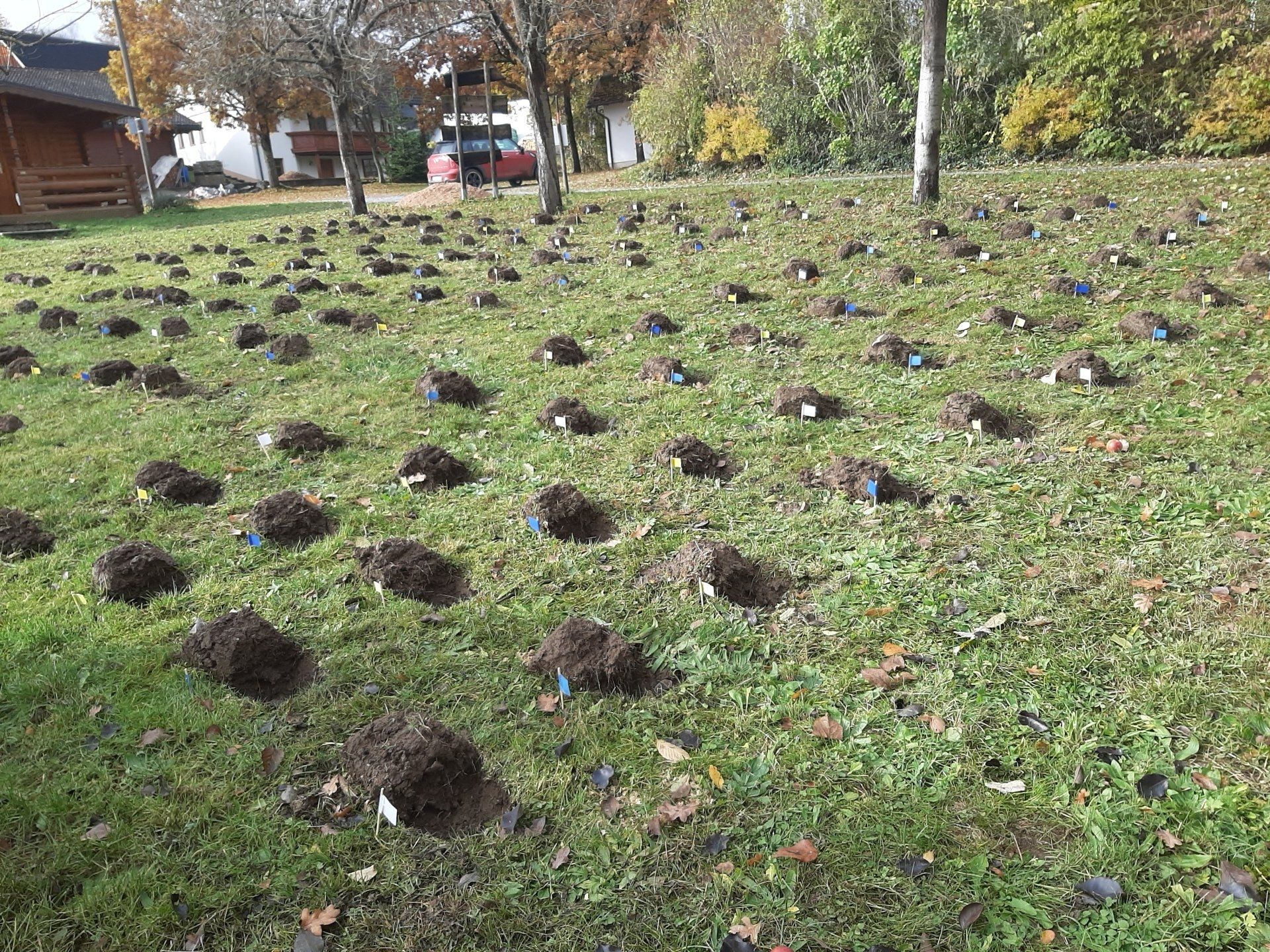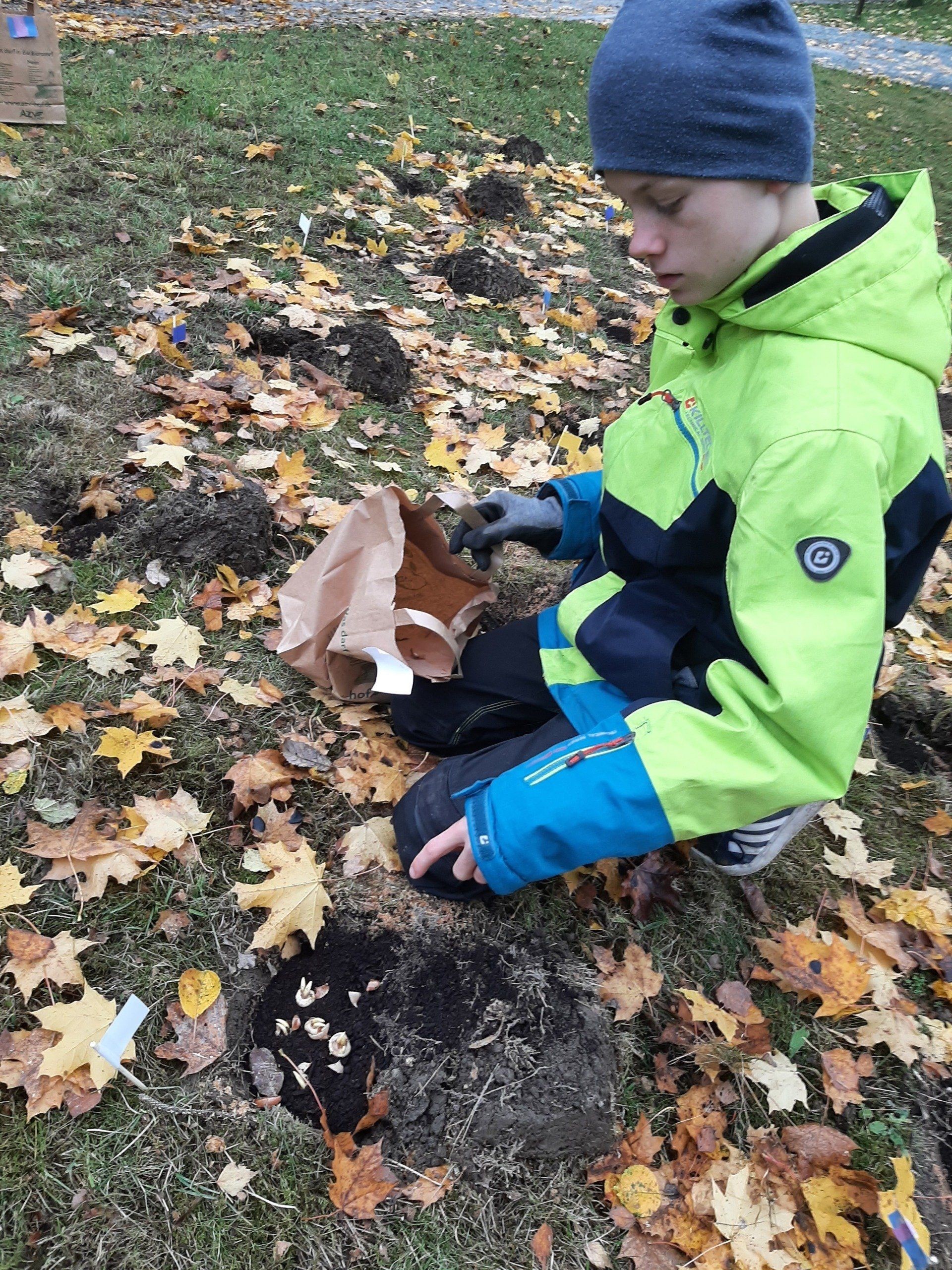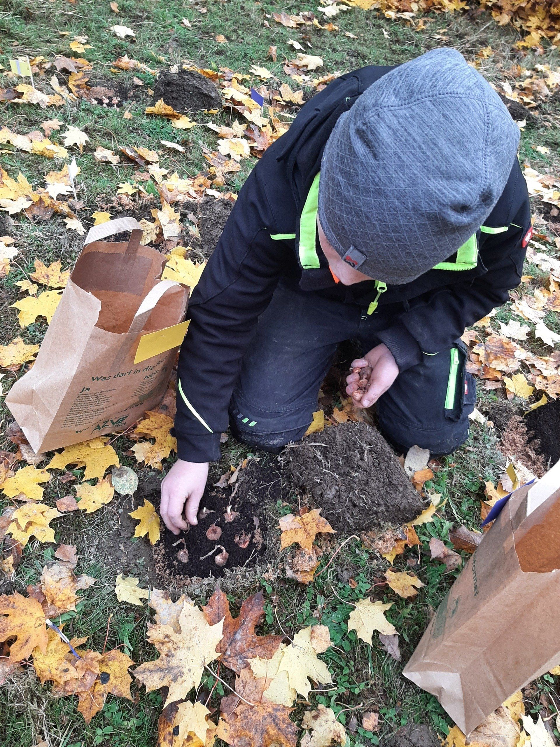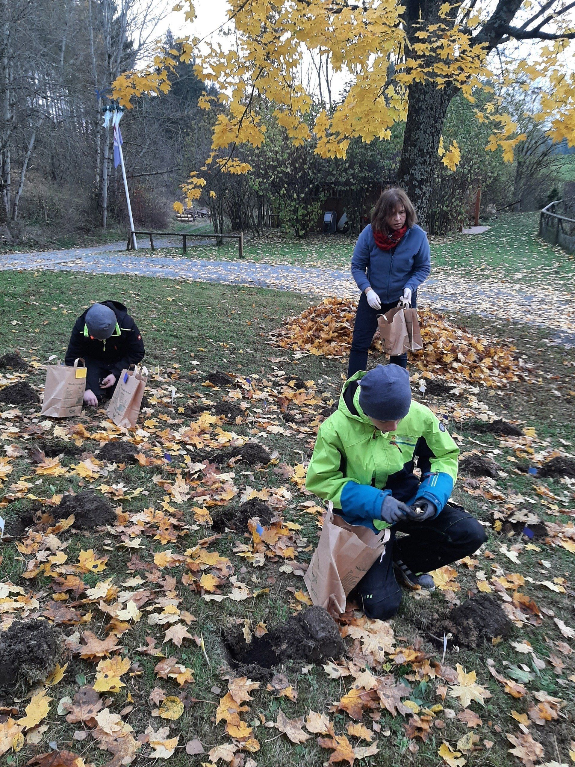 Fleißige Helfer hatten im Vorfeld schon über 300 Löcher ausgestochen. Die Aufgabe der Kinder war es nun, die Löcher mit Sand und Dünger und Krokussen zu füllen. Rund 2500 Krokuszwiebeln wurden so auf der großen Wiese gesteckt. Nach getaner Arbeit gab es noch eine Brotzeit.