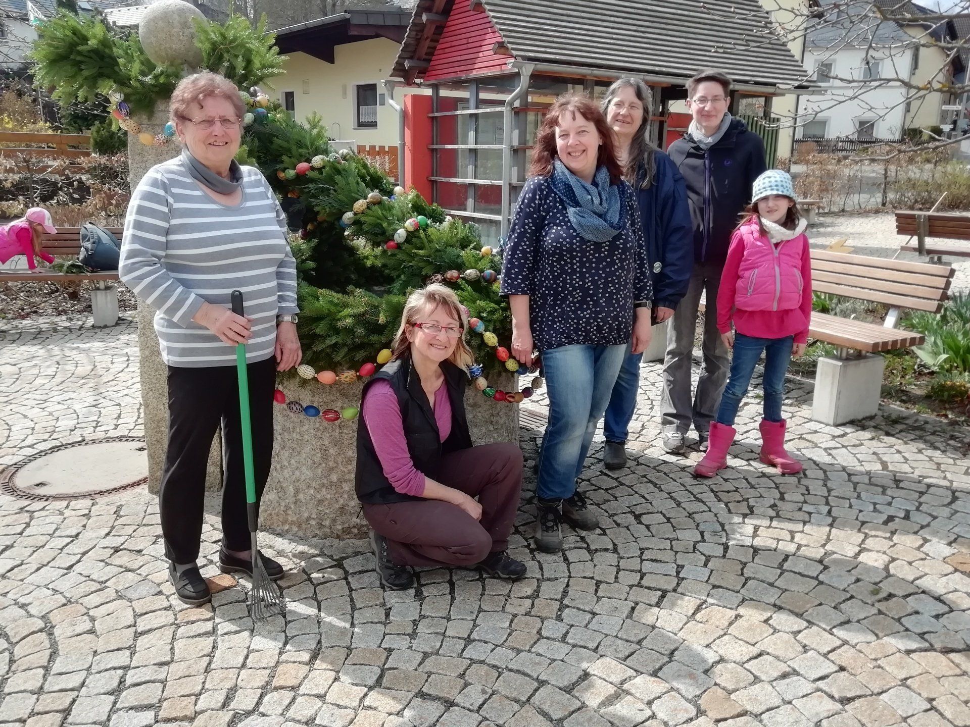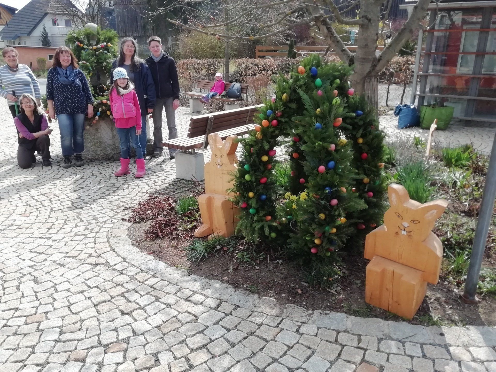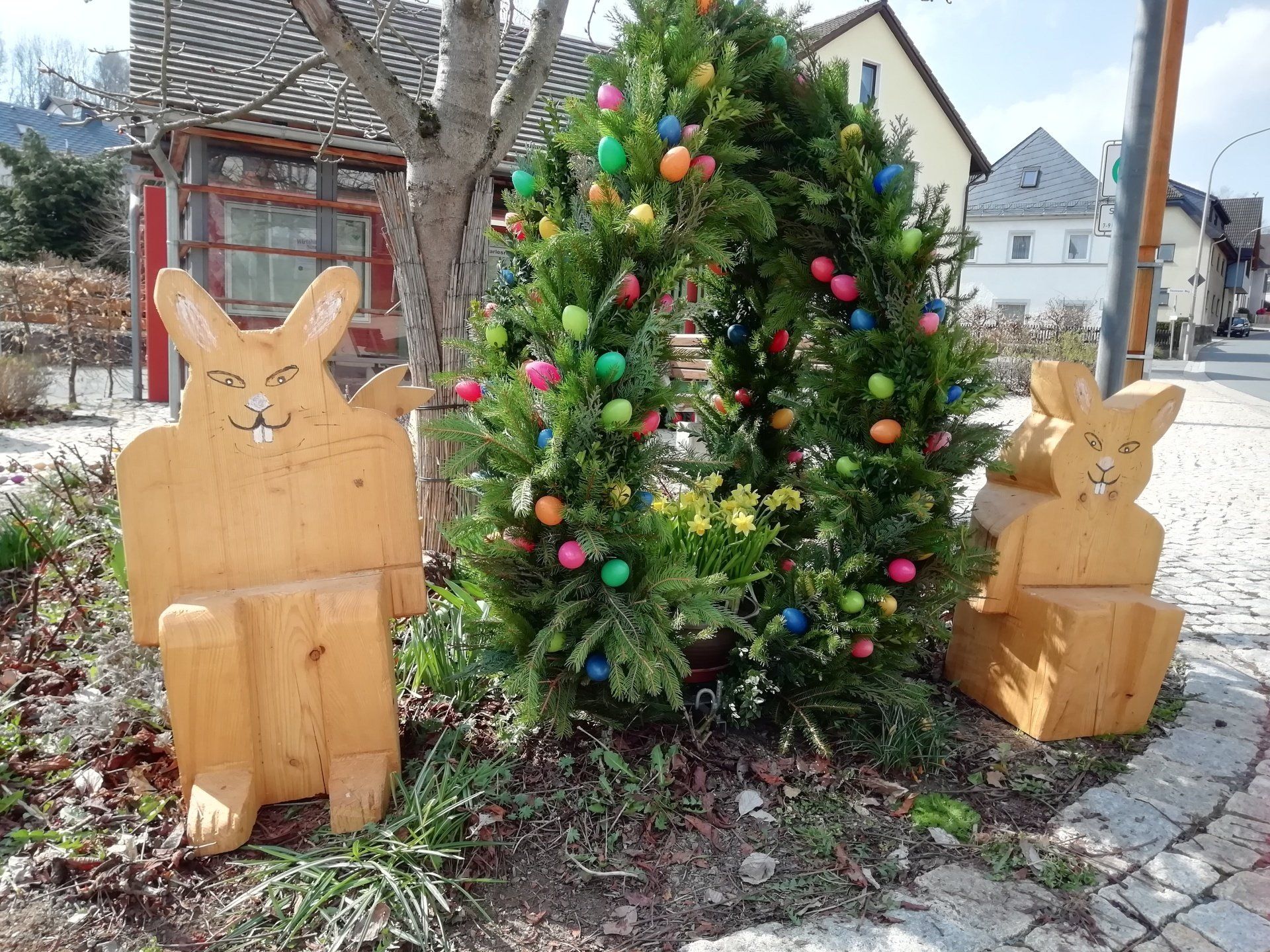 Seit einigen Jahren wird vom Gartenbauverein in der Dorfmitte der Osterbrunnen geschmückt. Neben dem Brunnen steht auch noch ein großes Osterei und ein paar Holzhasen, gefertigt von Alexander Hölzel.